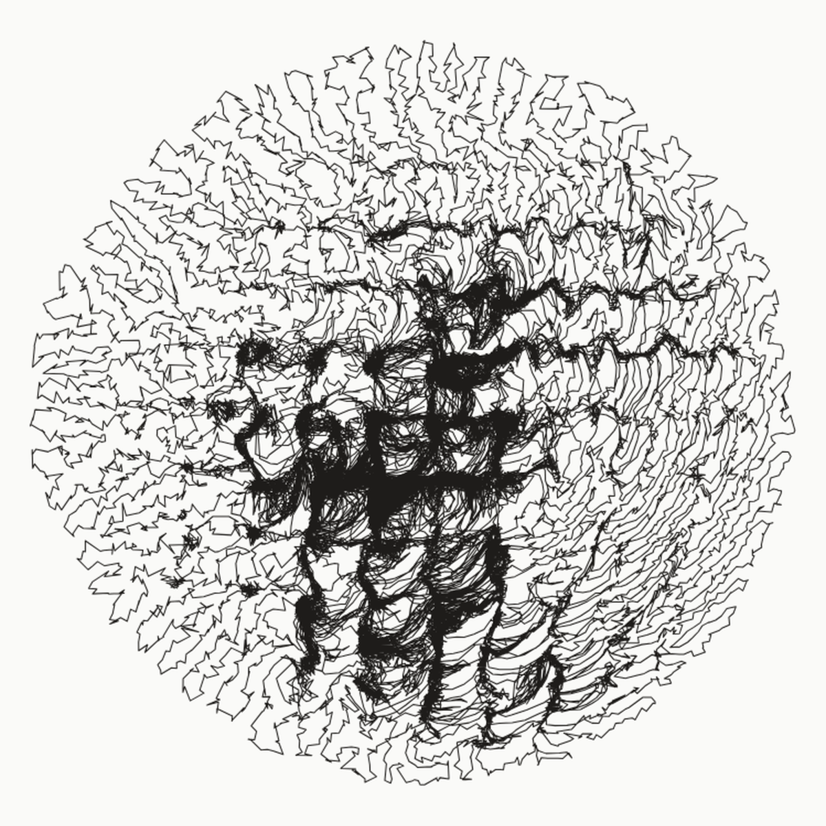 Une impression toner laser couleur d’un tracé auto-dégénératif (HTML/JS vanilla pur).